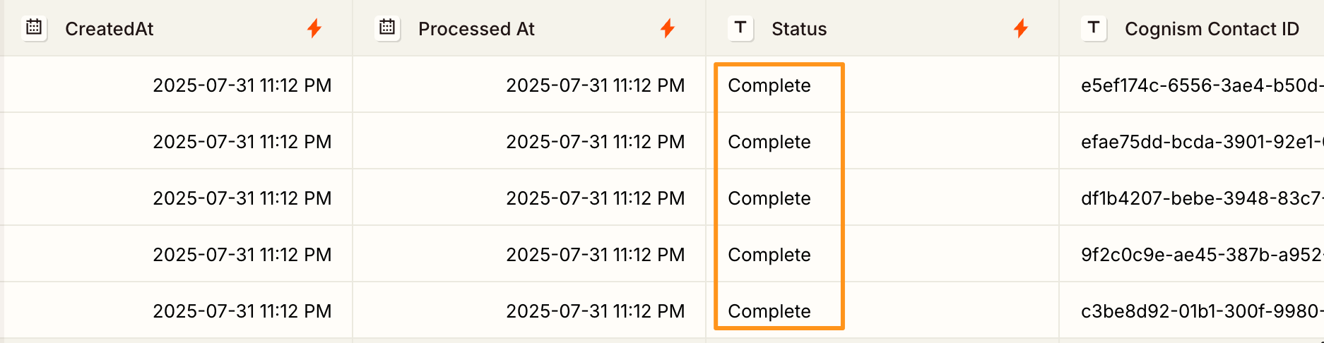 Each row gets a status—Pending, Processing, Complete—so I can track track progress at a glance.