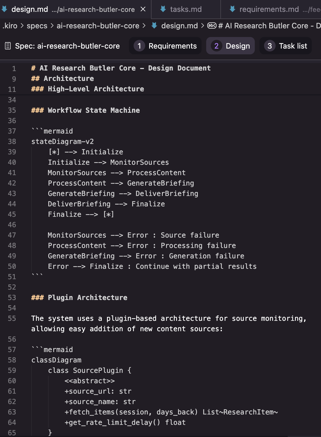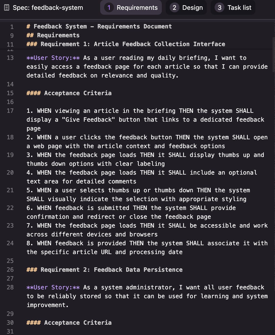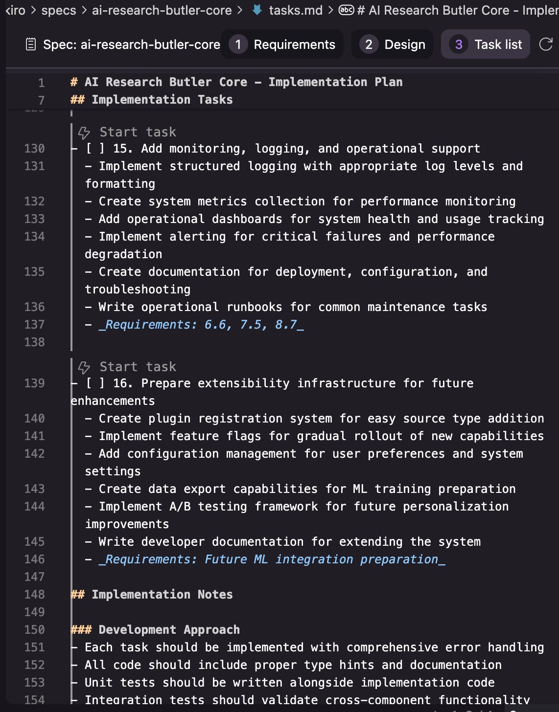 Since we now had a lot of undocumented features, I asked Kiro to generate specs retroactively, and it was able to quickly reconstruct requirements and outline the architecture choices.