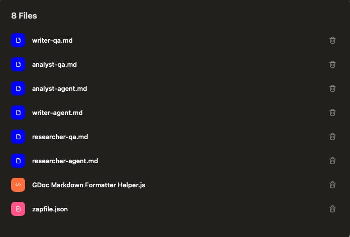 data files of workflows (e.g., I got a JSON of my Zaps using Zapier's bulk export feature)