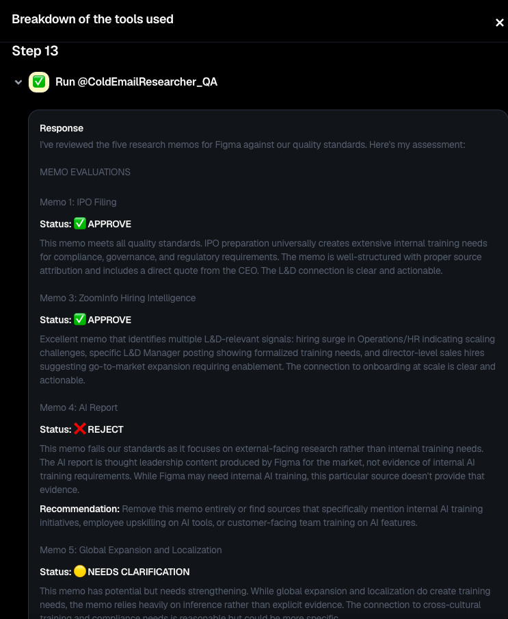 The first time I looked at the run history and saw these two agents dialoguing and actively improving the output together was amazing.